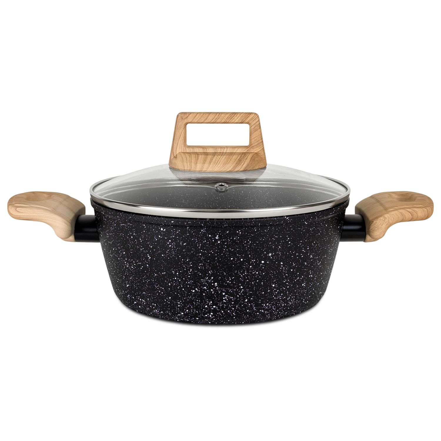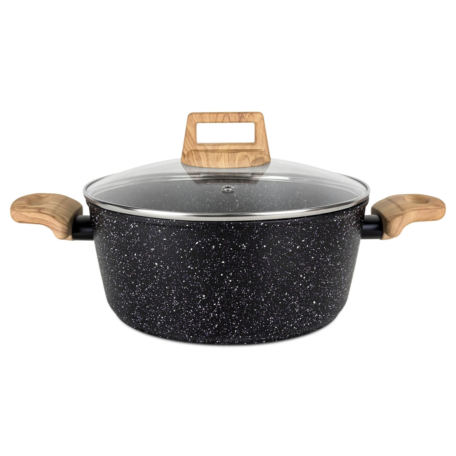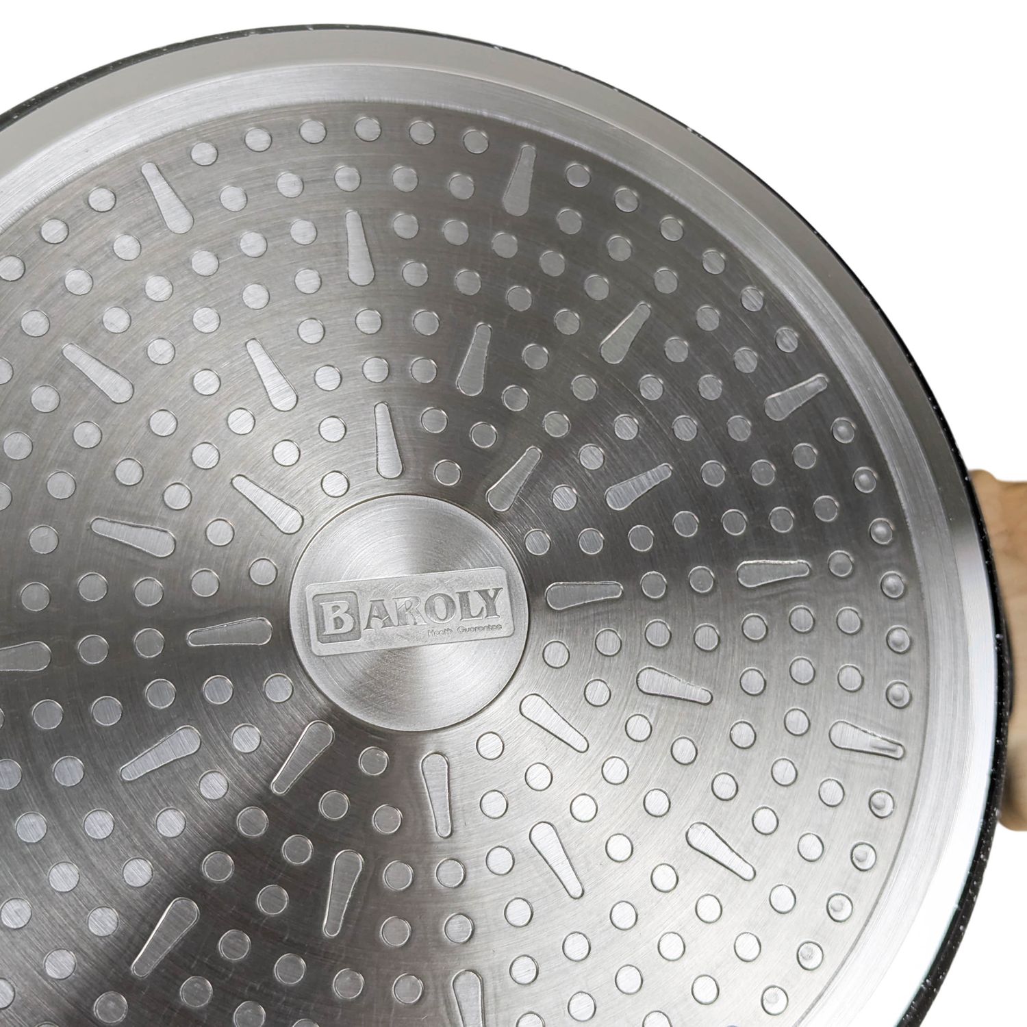 Batería de cocina Baroly de 7 piezas, con cuerpo de aluminio forjado y recubrimiento cerámico antiadherente de 3 capas. Base difusora que distribuye el calor de forma uniforme y brinda compatibilidad con todo tipo de cocinas, incluida inducción. Acabado tipo granito con mangos de baquelita símil madera y tapas de vidrio templado.