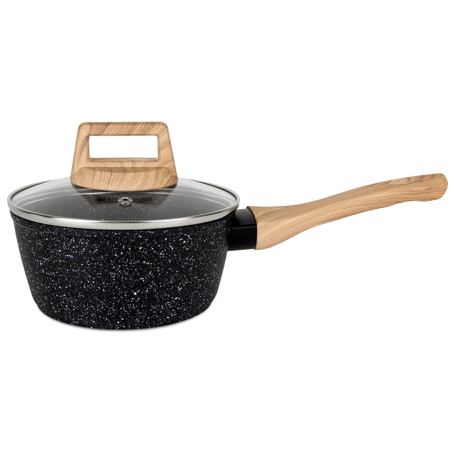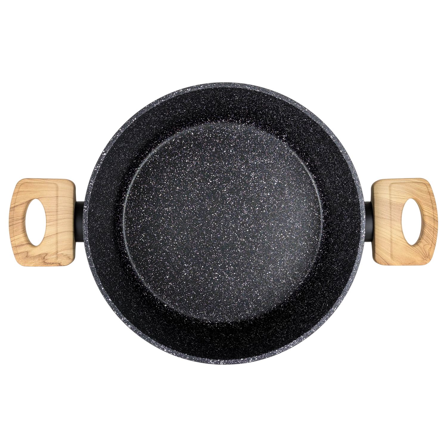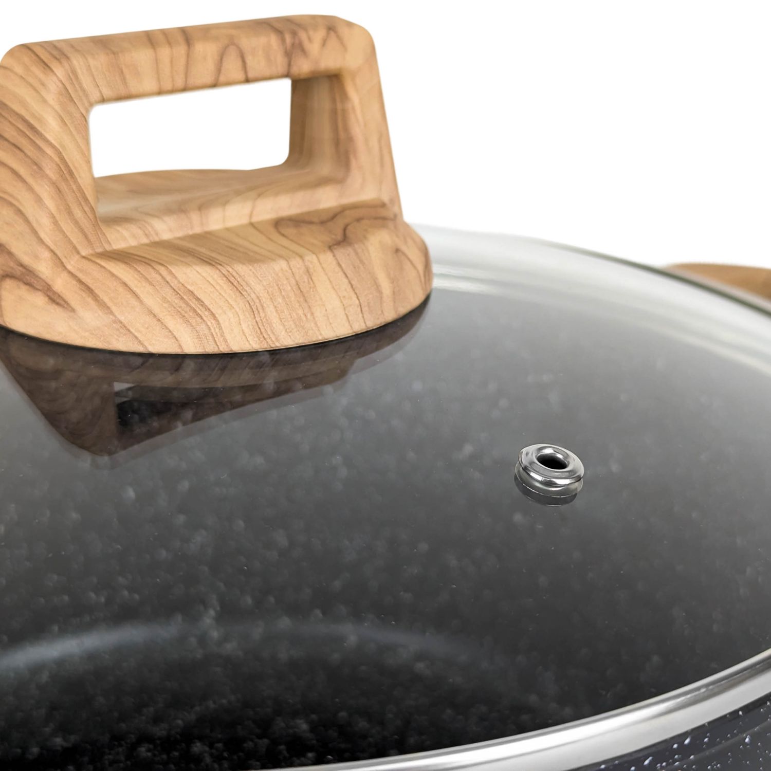 Batería de cocina Baroly de 7 piezas, con cuerpo de aluminio forjado y recubrimiento cerámico antiadherente de 3 capas. Base difusora que distribuye el calor de forma uniforme y brinda compatibilidad con todo tipo de cocinas, incluida inducción. Acabado tipo granito con mangos de baquelita símil madera y tapas de vidrio templado.