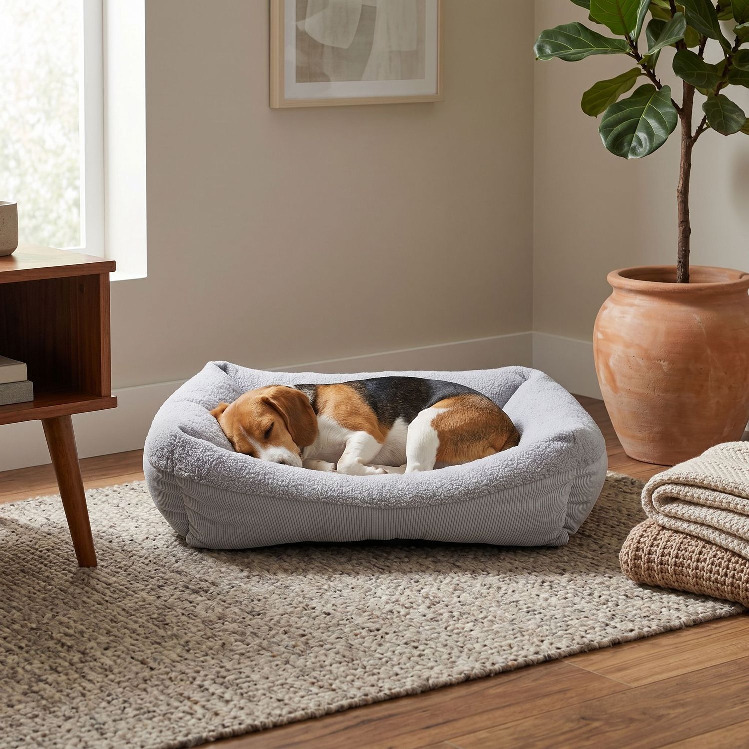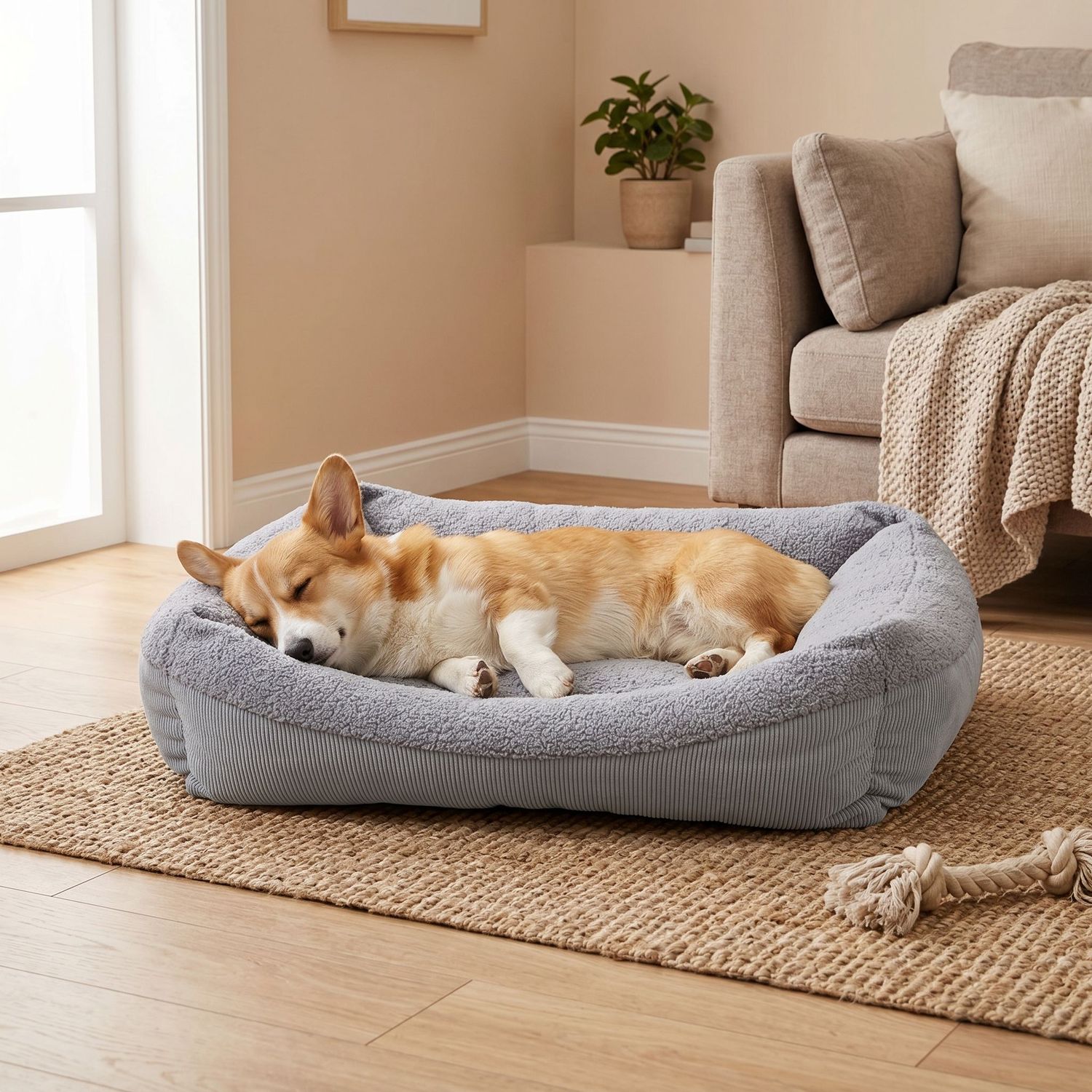 • Soporte Ergonómico: Sus bordes elevados funcionan como almohadas naturales, permitiendo que tu perro apoye la cabeza y proteja su columna, ideal para mascotas que aman dormir acurrucadas o apoyadas.