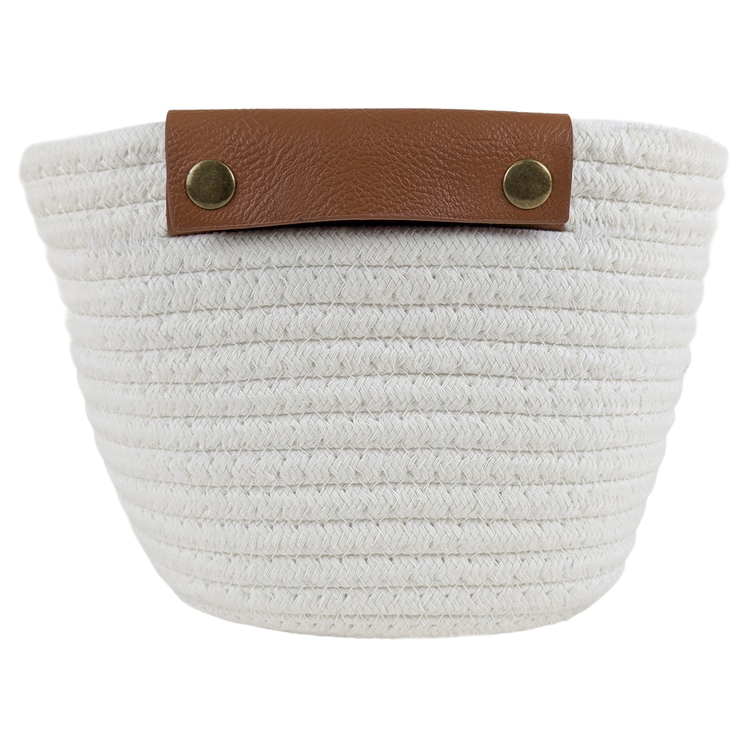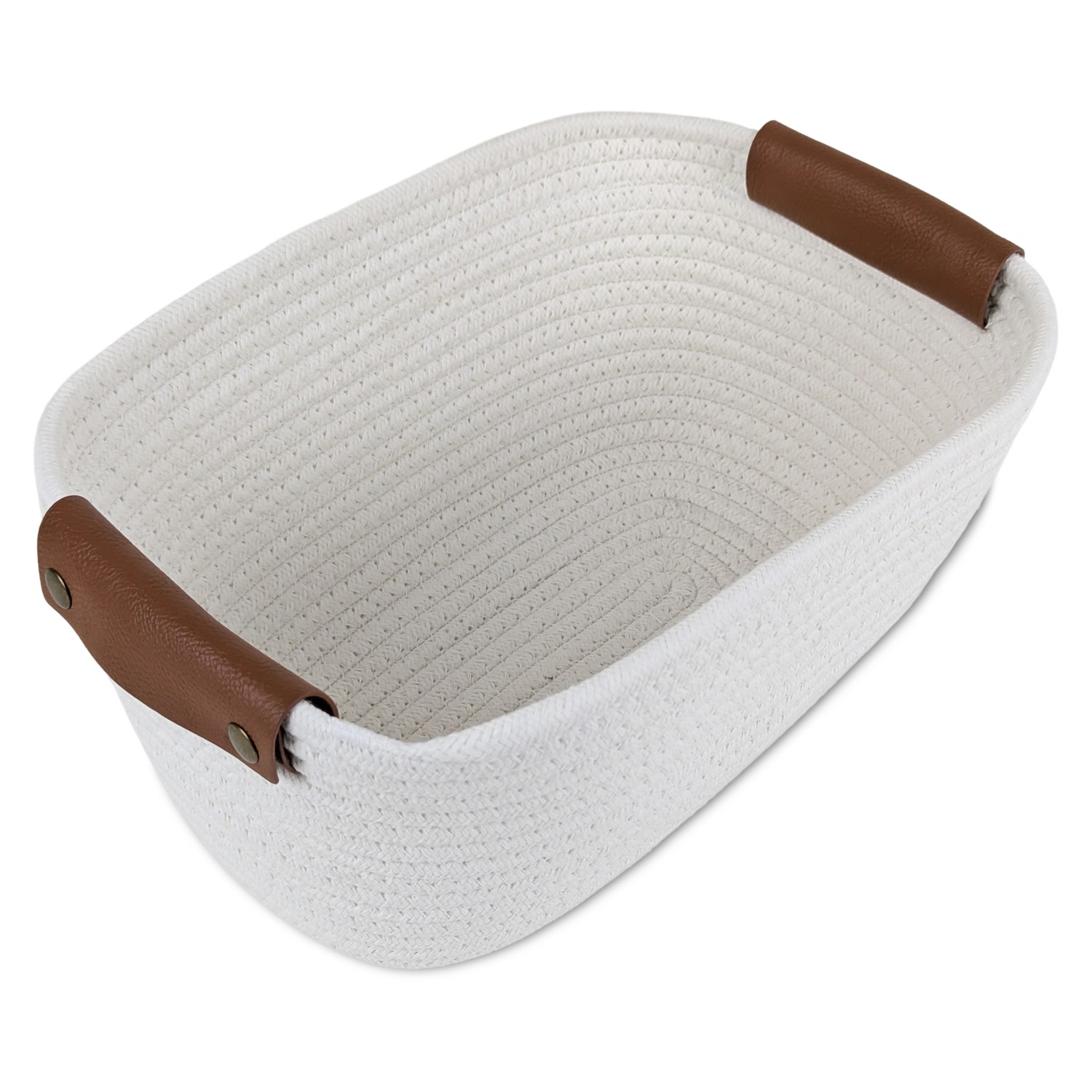 Versátil y práctico, este cesto multiuso es ideal para almacenar objetos o decorar cualquier habitación. Fabricado en tela blanca, con asas de cuero sintético marrón y broches metálicos, añade un toque distintivo y atractivo.