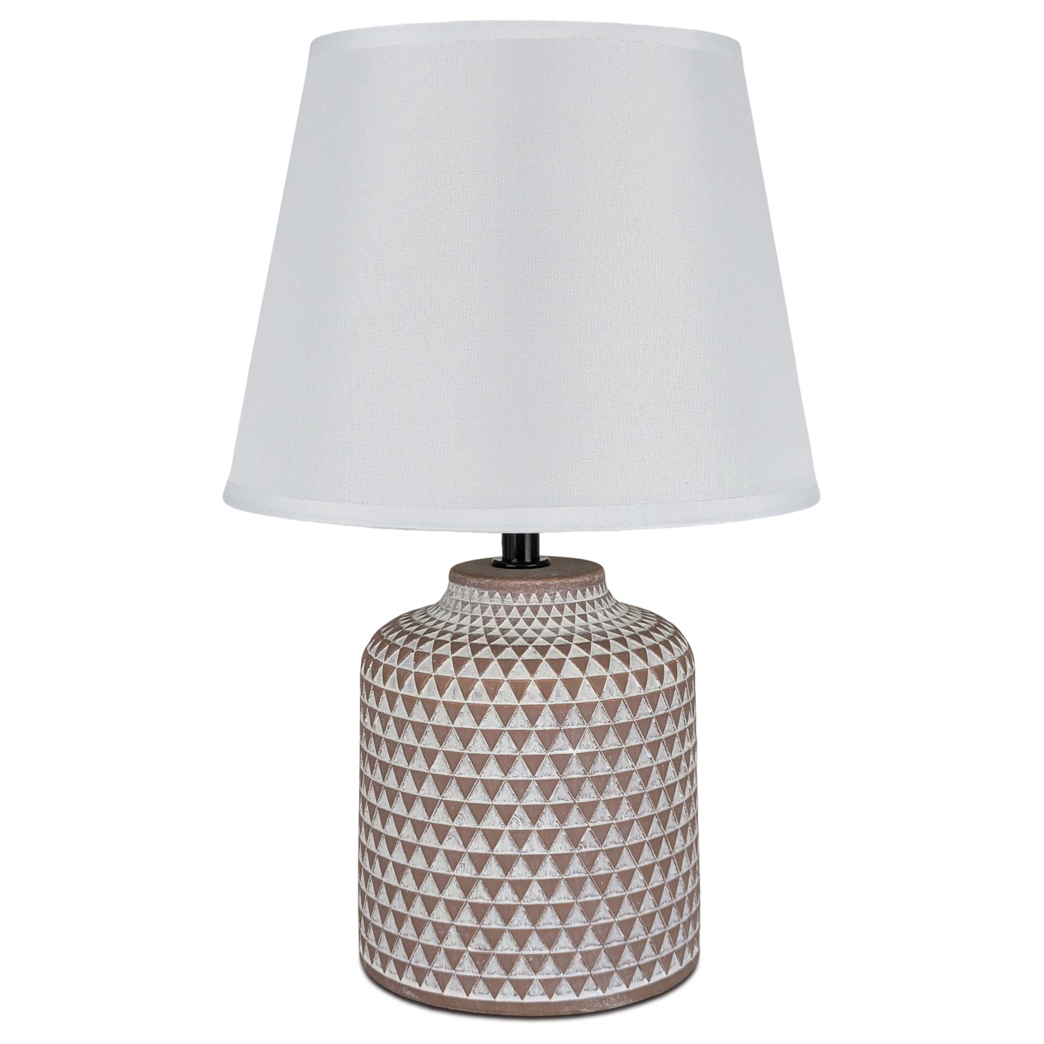 Esta lámpara de mesa destaca por su base de cerámica con un diseño geométrico en tonos marrón y blanco, que le aporta personalidad y un aire moderno sin perder la calidez de lo artesanal. La pantalla en color blanco suaviza la luz, generando una iluminación agradable y equilibrada.