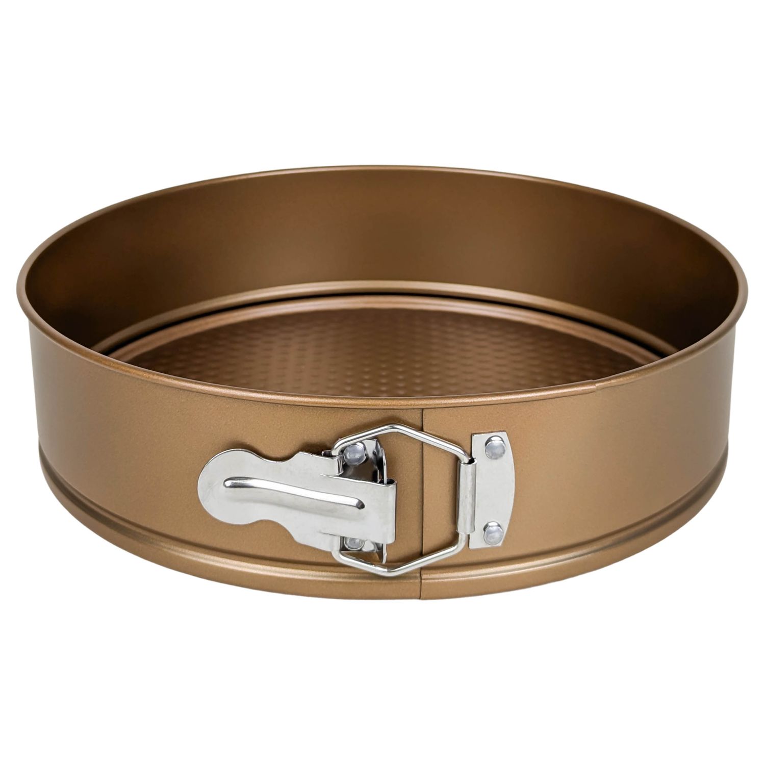 Molde con fondo desmontable y hebilla para sellado a presión, ideal para tortas, con doble capa antiadherente que facilita el desmolde y la limpieza. Compatible con hornos a gas y eléctricos, y apto para lavavajillas.