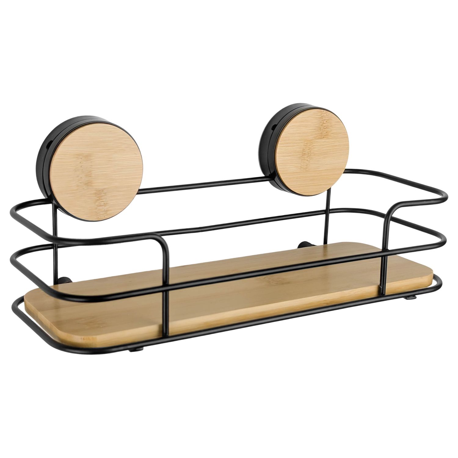 Porta shampoo adhesivo, en metal negro mate con detalles en bambú natural, estilo moderno y funcional. Permite organizar productos de baño con una instalación rápida sin perforaciones, aportando practicidad y un toque decorativo.
