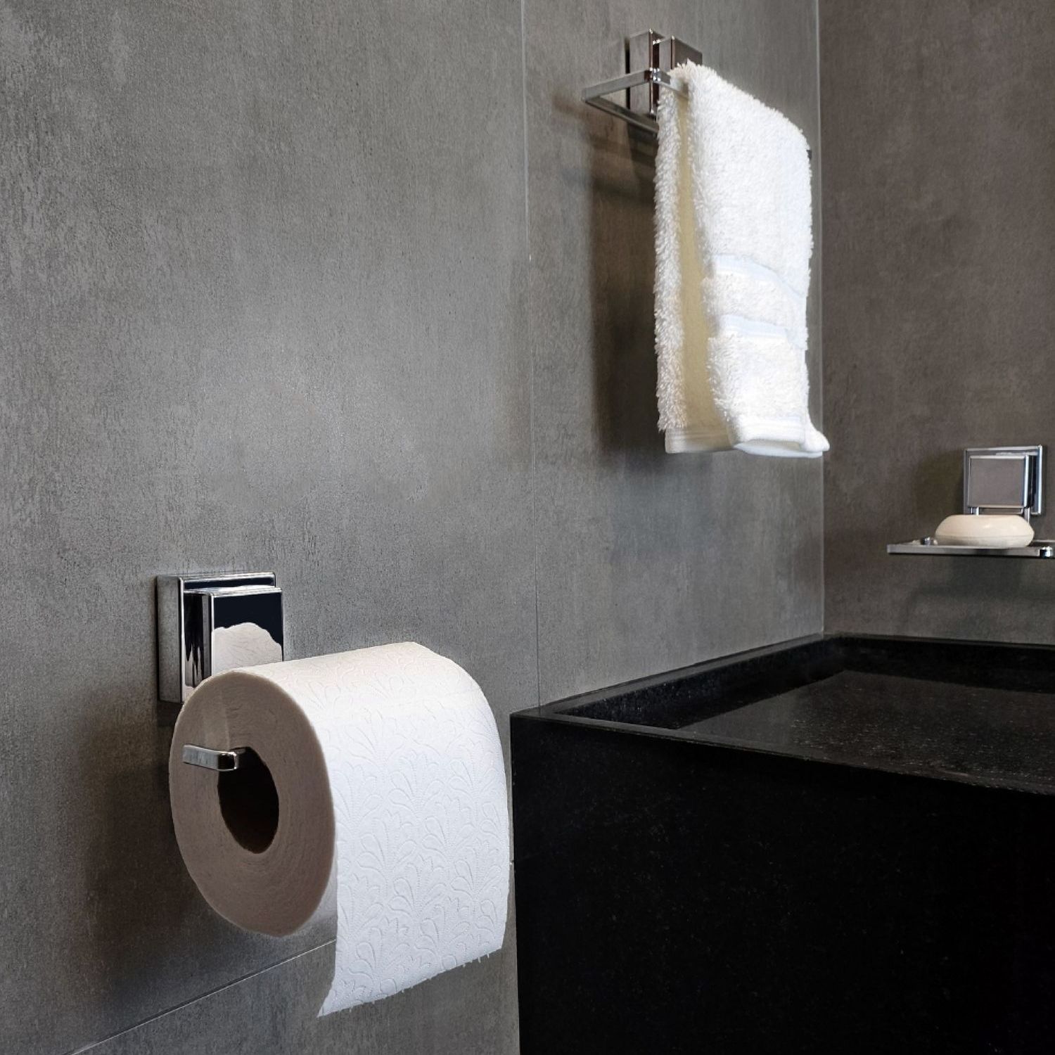La línea de accesorios Facile Mix de Future destaca por su fuerte adherencia y sencilla colocación. Este portarrollos está fabricado en acero de alta calidad con tecnología RUST FREE, asegurando resistencia al óxido, conservación del brillo y durabilidad en entornos húmedos. Cuenta además con un diseño simple y elegante.