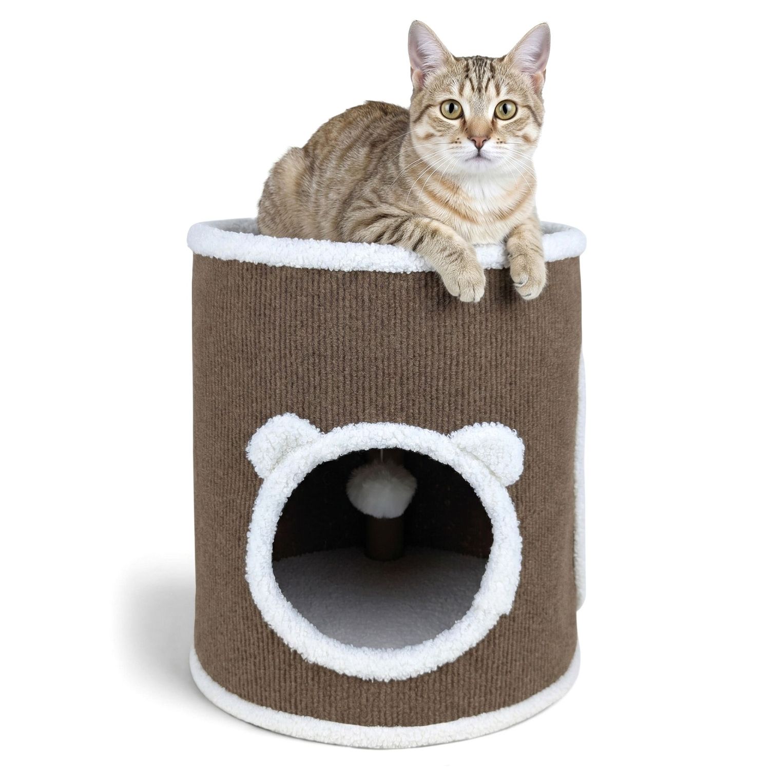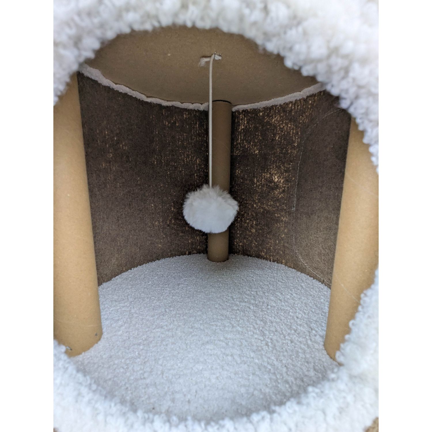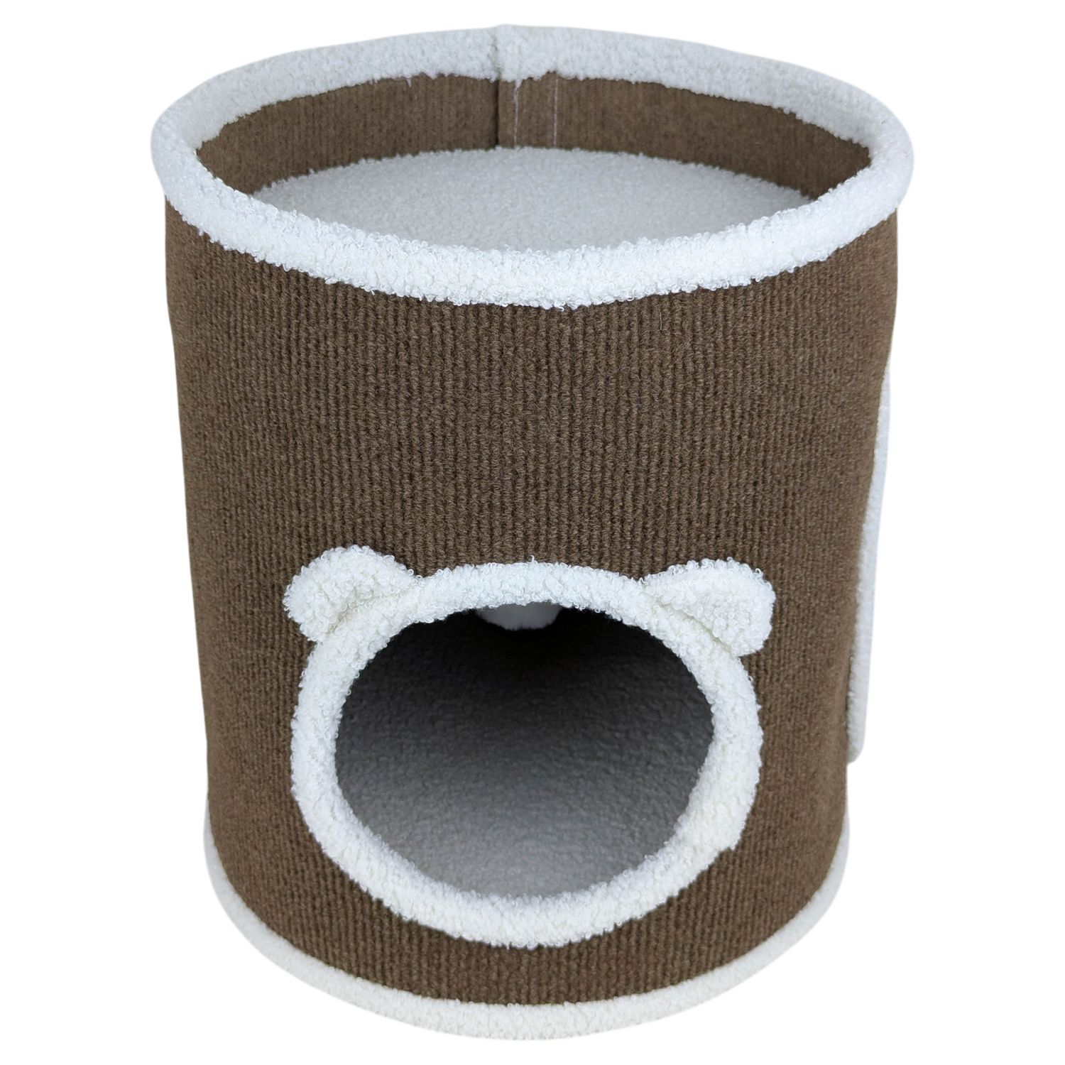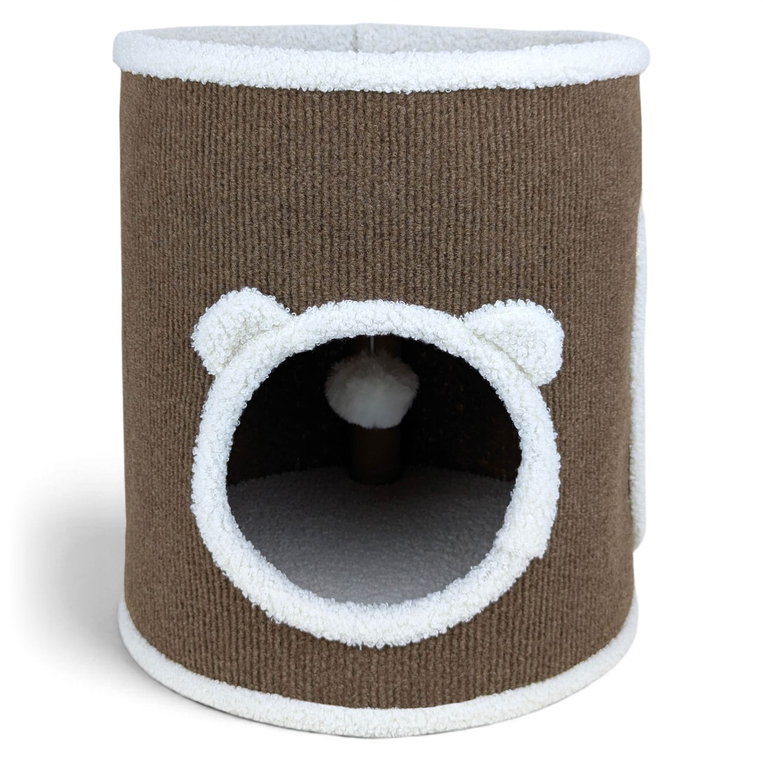 • Cueva de juego: La cara frontal presenta una abertura central única con forma de cabeza de osito. Esta abertura está ribeteada con un suave peluche blanco que invita a entrar. En el interior, tu gato encontrará un pompón colgante para horas de juego interactivo y caza.
