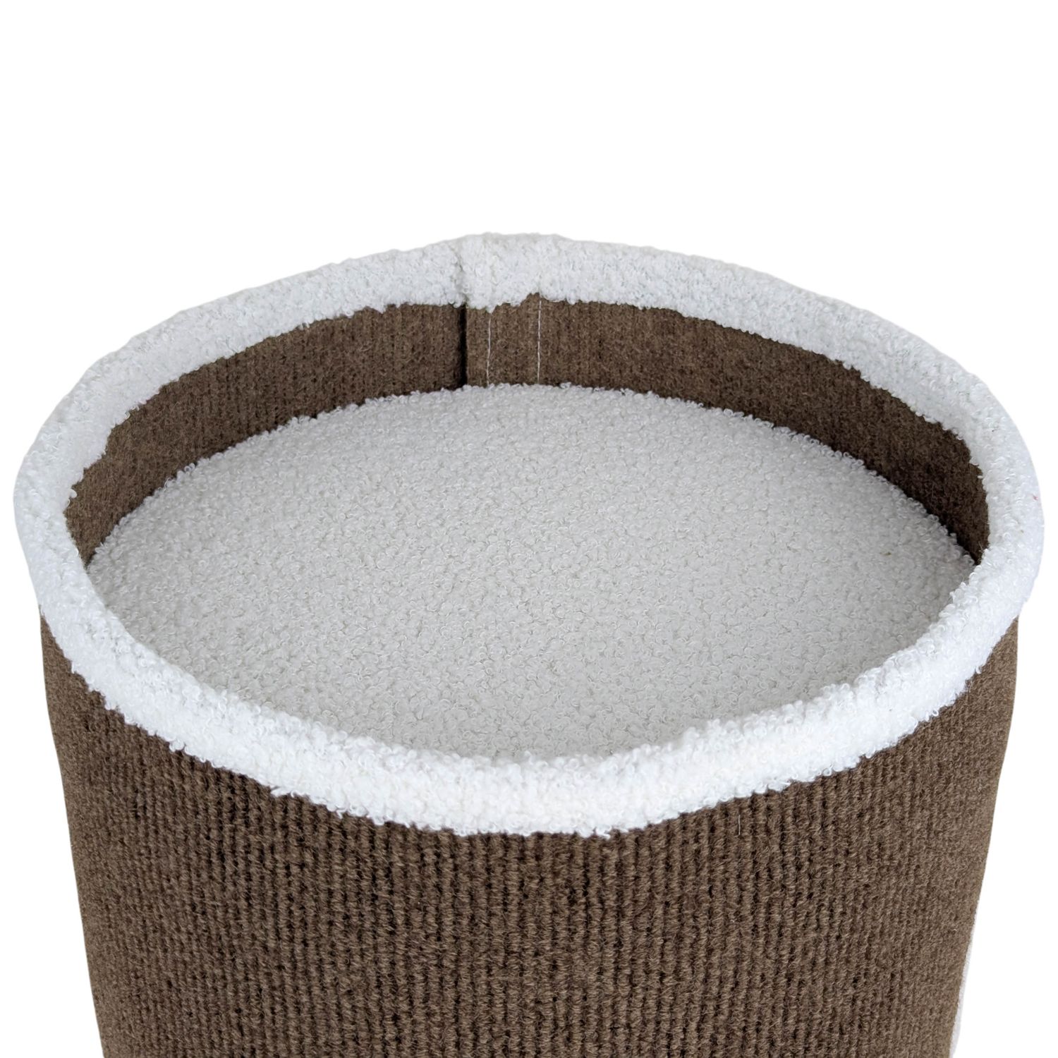 • Área de rascado: La parte lateral del cilindro está cubierta por una generosa superficie de sisal natural tejido, perfecta para que tu gato afile sus uñas de forma segura y satisfactoria, redirigiendo las actividades de rascado lejos de tus alfombras, muebles y sofás.