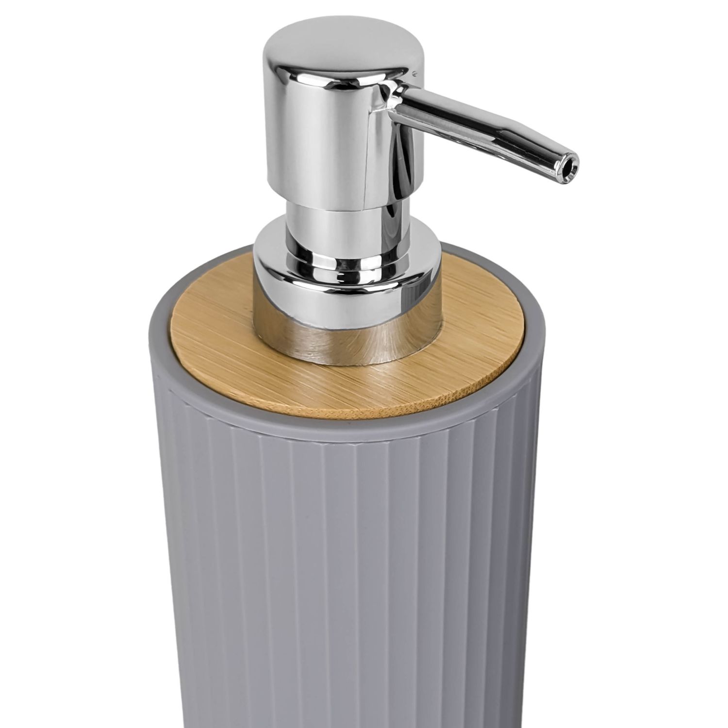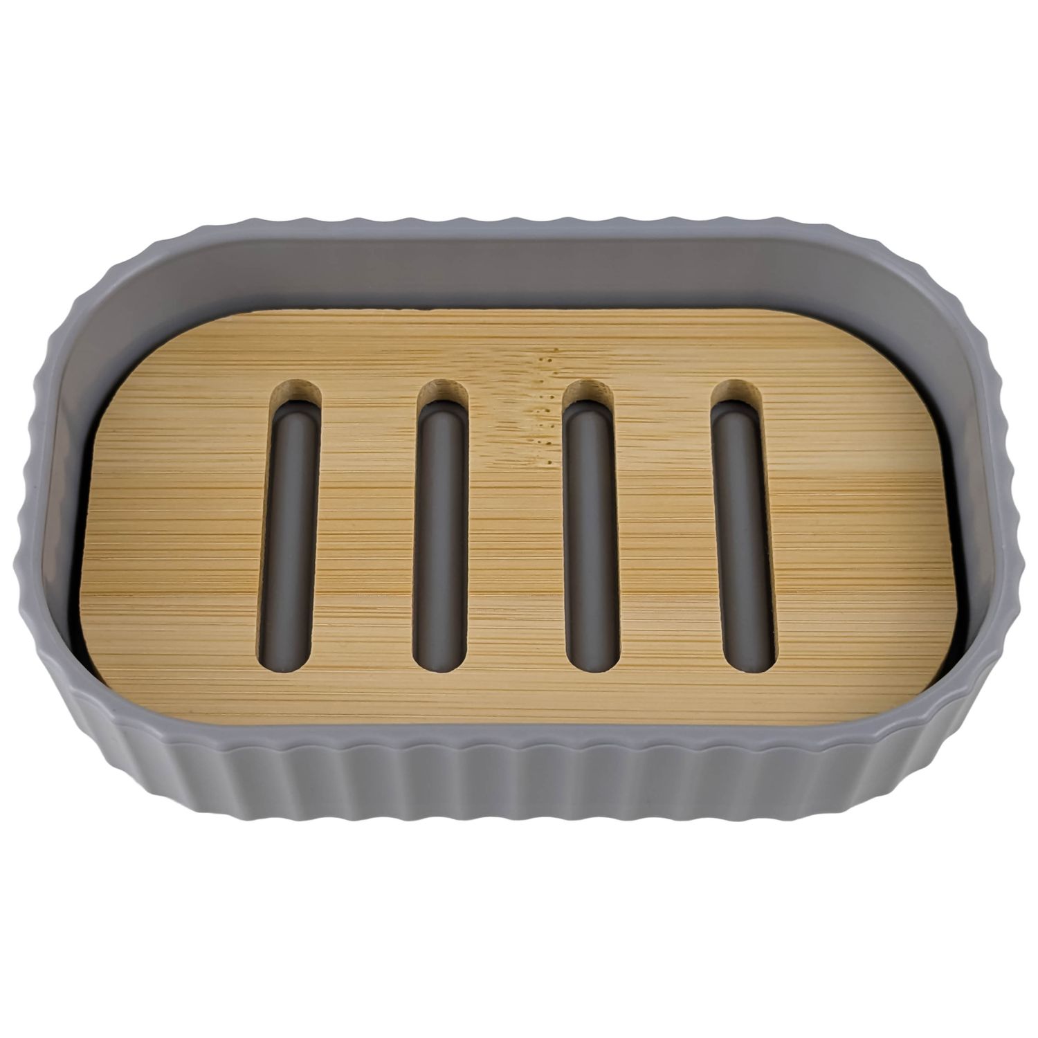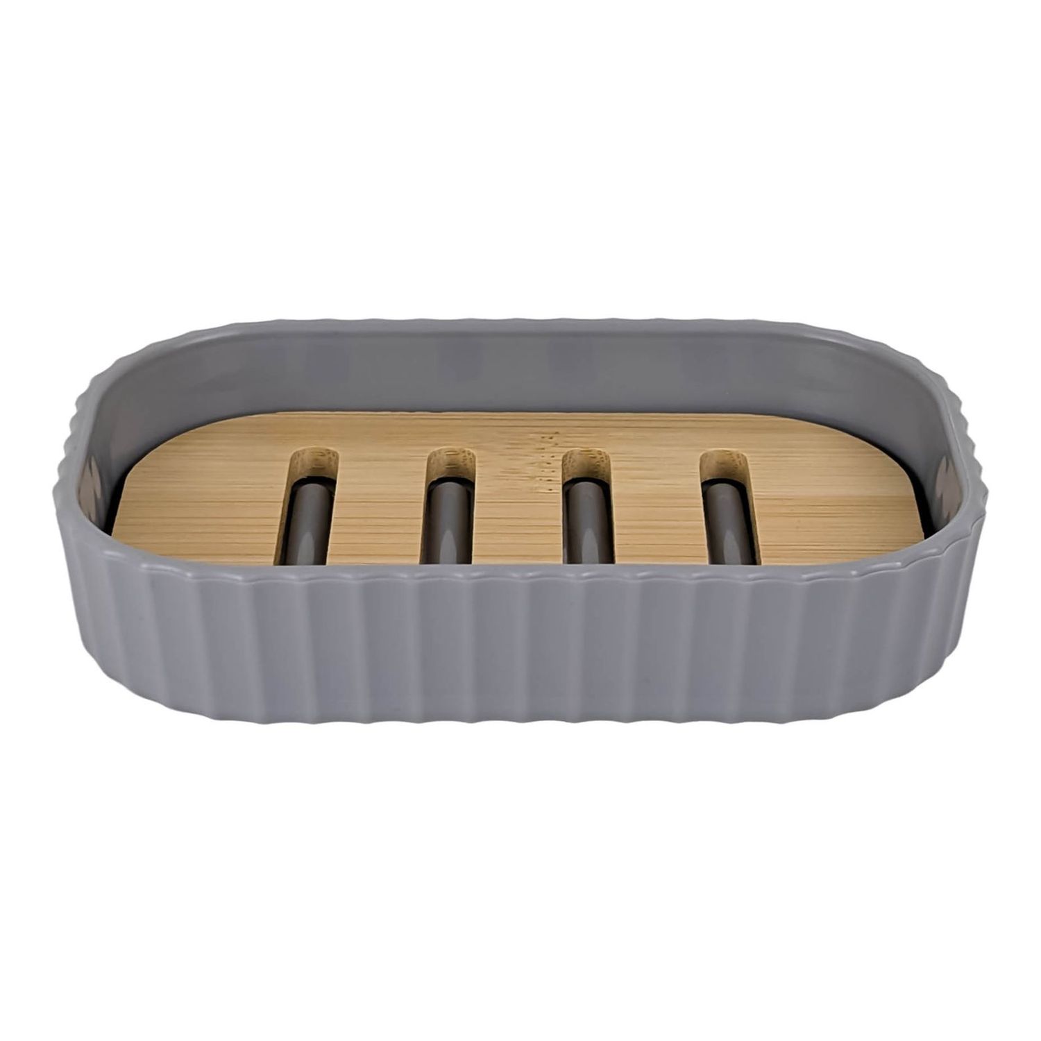 Moderno y completo conjunto de baño de 6 piezas, fabricado en resistente plástico, con diseño circular y detalles en madera de bambú.