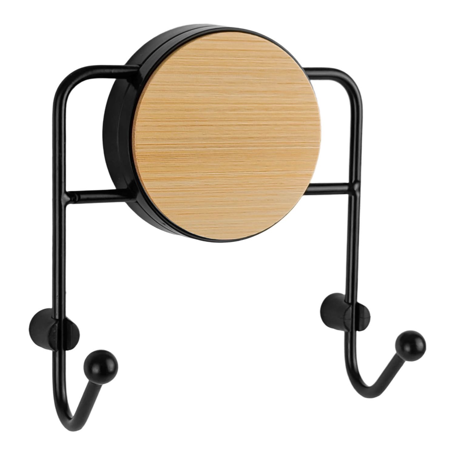 Gancho doble multiuso adhesivo, en metal negro mate con soporte de bambú natural, diseño moderno y funcional. Ideal para el baño, la cocina u otros ambientes, ofrece una instalación rápida sin perforaciones y un toque decorativo práctico.